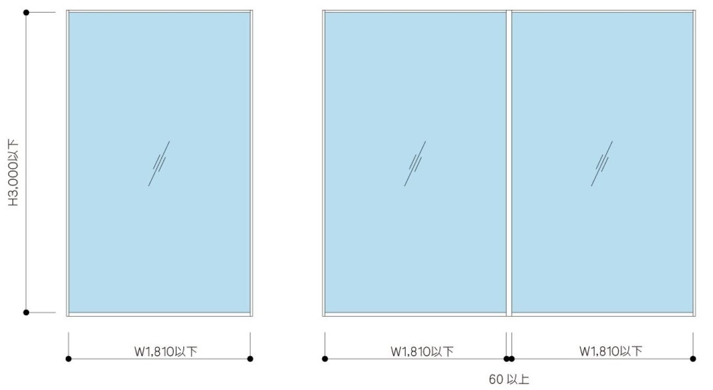 | 最大寸法(※) | W1,810ミリ×H3,000ミリ(ガラス1枚の最大見付寸法) |